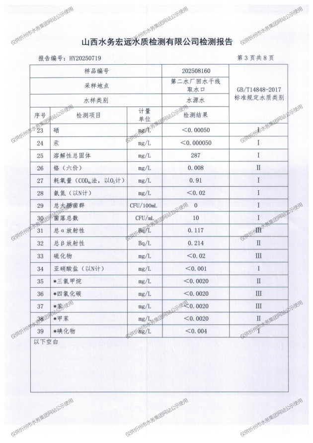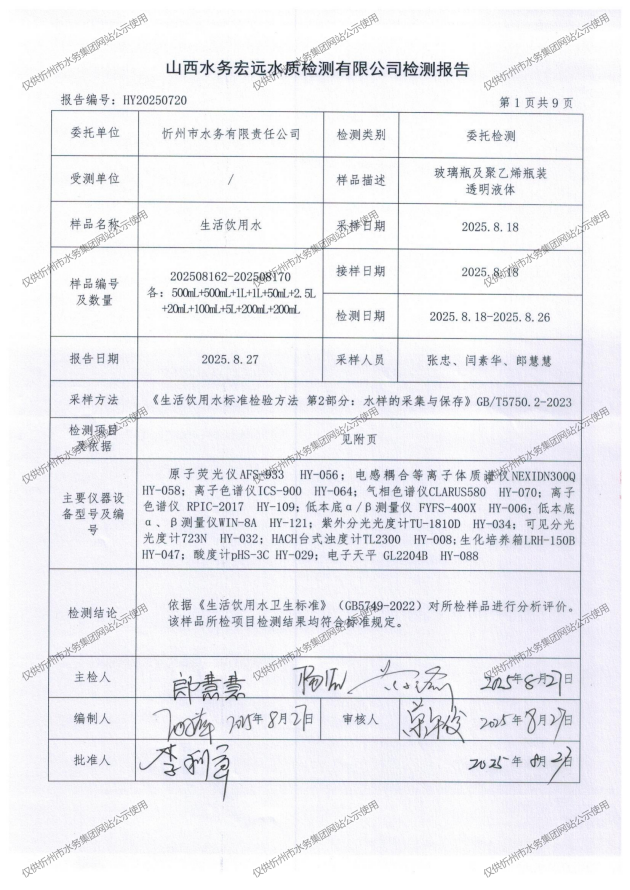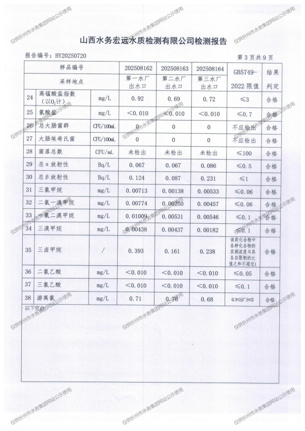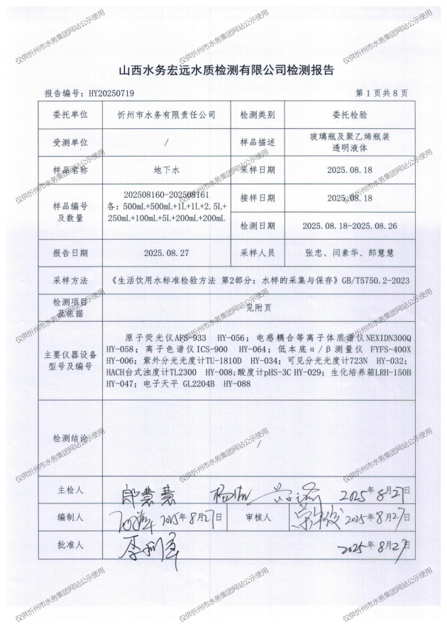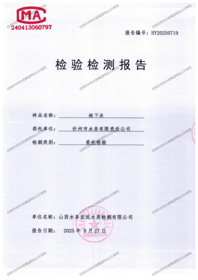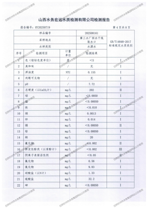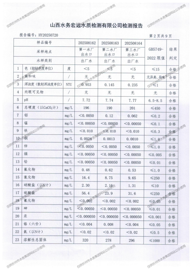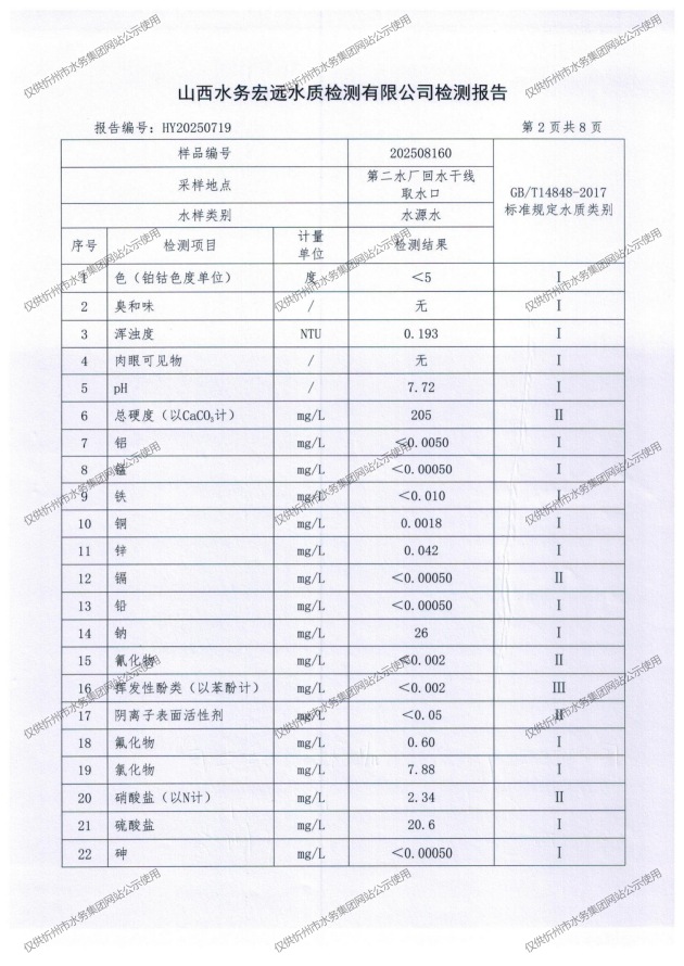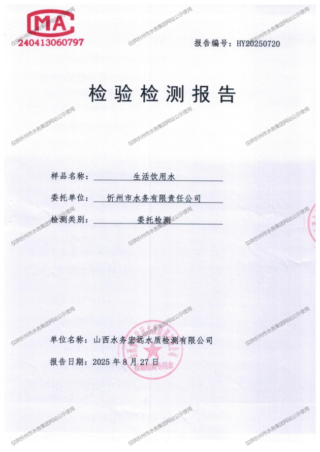 忻州城區(qū)公共供水水源水、出廠(chǎng)水、管網(wǎng)水、管網(wǎng)末梢水2025年8月份水質(zhì)信息公示